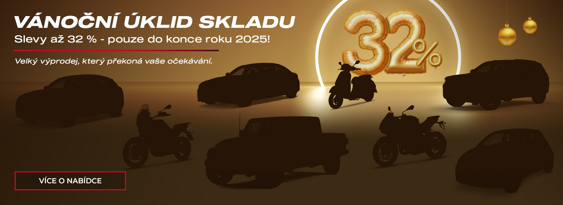 IMOFA spouští Vánoční úklid skladu, v rámci kterého zákazníci mohou až do konce roku 2025 využít výrazných slev napříč naším širokým portfoliem vozů i motocyklů. Akce se vztahuje jak na nové, tak i na předváděcí a prověřené ojeté exempláře.